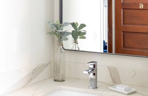 The bathroom has a deep bathtub with tiled shower, custom built cedar vanity with a quartz countertop. The bathtub is modern and deep along with a subway tiled shower. We provide BeeKind shampoo, conditioner & shower gel with a fragrance that encompasses citrus and honey. BeeKind is carefully crafted from high-quality ingredients and essential oils and contains NO parabens, phthalates or petrol-derived ingredients.