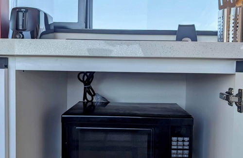 Inside, the living area is both inviting and practical, with a well-equipped kitchen, dining nook, and a dedicated workspace. The Murphy bed doubles as a seating area, and the modern bathroom includes all the essentials for a perfect stay. No detail was overlooked to make this your perfect home away from home.
