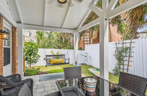 ⭐You'll want time to relax in this private backyard oasis with a covered pergola, enchanting porch swing, additional outdoor seating, a BBQ grill, a cornhole set, and twinkling lights to enjoy at dusk. With access to the garage, you'll have room for one vehicle, plus 2 additional on the driveway. Located in the garage are 4 complimentary bikes, beach chairs, an umbrella, boogie boards, a cooler, and sand toys for guest use during your stay. Golf carts are welcome if you plan to rent one while visiting.
