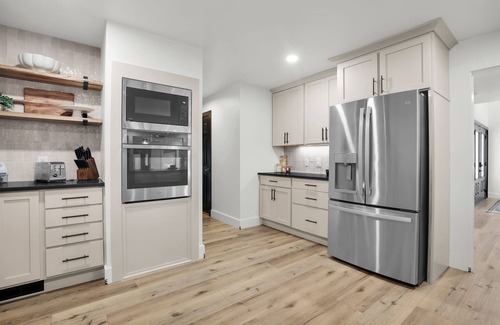 -Fully stocked kitchen with essential cooking utensils / appliances.