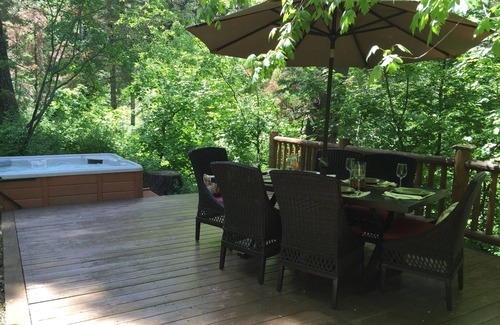 This secluded mountain home is a great place to unwind and get away from it all. Surrounded by forest and with six bedrooms (2 kings, 2 Queens, 1 Double, 1 with pair of twin bunk beds, and even 1 pull-out sofa bed) it is ideal for families reuniting or groups of couples who want quiet surroundings. There are three separate living areas ( a large formal living room with 2 fireplaces, a cozy TV room off the kitchen, and a large TV/ping pong/play room in the basement) which means that there is room for a rousing group board game, but individuals can still find a cozy corner to curl up in front of a fire with a book or a movie.