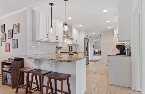 Escape to this charming lakeside retreat, where stunning sunsets and unbeatable water views await! Sitting right on the water, this cozy home offers a dock with a slip, two paddleboards, two kayaks, and a hot tub for ultimate relaxation. Dine outdoors by the lake, gather around the fire pit table, or enjoy the kid's game room with foosball and an arcade. With its vintage charm and unbeatable location, this is the perfect getaway for families and friends looking for lakefront fun!