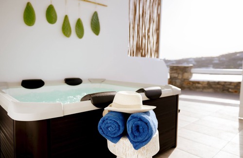 The beachfront apartment offers Cycladic-style accommodation with furnished balconies overlooking the Aegean Sea. It is an 50sqm house with a private veranda of 25sqm with private jacuzzi overlooking the Aegean Sea.