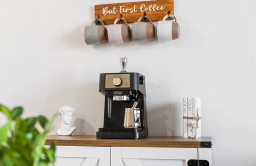 ☕️Warm and inviting, this 1BR suite offers cozy charm with a private balcony, curated espresso bar, spa-like bath, Smart TV, laundry, and a fully stocked kitchen with new appliances. The plush sofa bed adds sleeping space for 2 🛌
