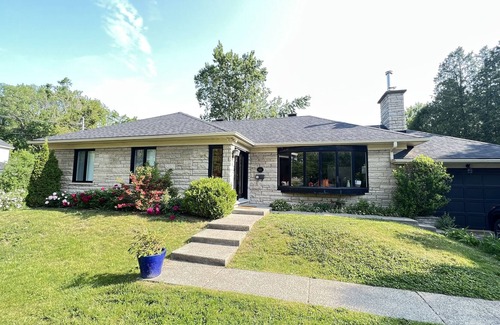 [Very child friendly, quiet, surrounded by a large garden, tall trees, and singing birds. Express bus to Montreal (or Ste Anne de Bellevue) takes you to downtown Montreal in less than 30 mins. Cinema room with large projector and AppleTV. Walking distance to St. Louis lake, Pointe Claire old village and windmill, Fairview shopping mall, Angel woods.