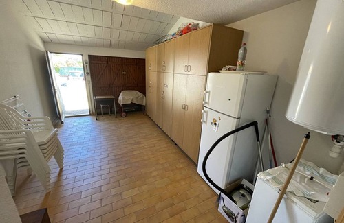 South of the resort, pleasant dual-aspect holiday home for 6 people, approx. 65m², T3 type, garage (for bicycles or motorcycles). Paved courtyard at the front and tiled terrace at the rear, facing south/west, equipped with garden furniture, awning, charcoal barbecue, and electric griddle. Entrance via a converted garage with a large closet, fridge-freezer, and washing machine. Living room with a 140x200 sofa bed, smart TV, and fiber optic Wi-Fi router. Equipped kitchen area: 4 electric hobs, microwave, dishwasher, oven, and electric coffee maker. Separate toilet. Upstairs, 1 bedroom with a 140cm bed, closets/wardrobe, and loggia. A second bedroom with two single beds (90cm) and large closets. Bathroom. Parking for 1 vehicle is available in the front driveway, and 3 visitor parking spaces are available in front of the house. East/West exposure. Ideal for family vacations, located approximately 500m from the beach, Aqualand, and shops. RES. WITH SMALL SECURE POOL, open from June 1 to September 30. PETS ALLOWED.