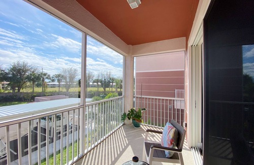 The spacious and screen-tinted lanai is furnished with 2 outdoor seats and small side table to rise with the sun over a delicious coffee in the morning.