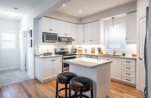 This 1800 square foot house offers all of the amenities from home including a fully equipped kitchen, all new stainless steel appliances (including dishwasher), washer/dryer, central air, unlimited Wifi, Bell Fibe television and a propane BBQ. Comfortably sleeping up to 8 guests as well as providing a separate office space for travelling workers.
