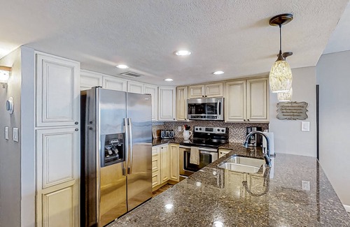 Start your days with sunrises and fresh-brewed coffee out on your furnished balcony as the beach comes alive down below. Prepare anything from quick breakfasts to full-course dinners in the well-equipped, full kitchen with stainless steel appliances, and then dine together or play a few board games at the adjacent table. After meals, recline on the matching sofas in the sunlit living area and watch TV, or set your laptop up on the desk in the main bedroom and go online to address some remote work or plan out your vacation days. This condo also comes equipped with central air-conditioning and a private washer/dryer.