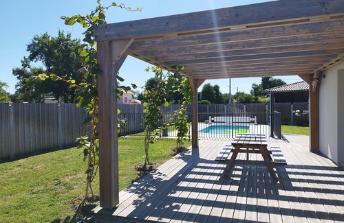 Sunny villa with two large wooden terraces, a secure pool and a petanque, all surrounded by green space.
