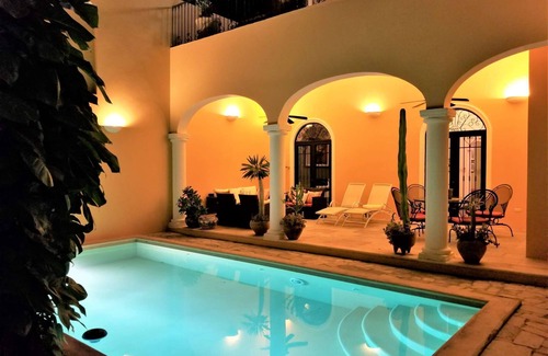 Under arched doorways and wrought-iron details, the sun dances throughout this big, bold colonial-era home in the colorful heart of Mérida centro historico.