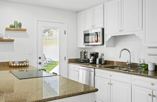 The fully equipped kitchen is a social cook's dream, with a stunning quartz countertop and seating surrounding the glass cooktop. Enjoy a delicious meal in our oversized dining area, which seats 12 and features a fun Ms. Pac Man machine for after-dinner challenges. Step outside to our oasis backyard through the sliding glass doors!