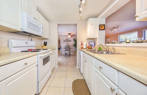 Sunset Villa has ceiling fans in the living room, dining room and eat-in kitchen. Also for your convenience is a roomy garage with inside entrance to the house and an automatic garage door opener is provided for your use.