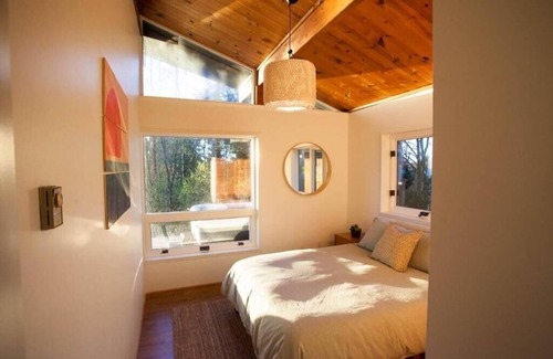 Soak up panoramic ocean views from this mid century modern dream cabin. Enjoy the sunset from the large hot tub, or the stars by the fire-pit, or just layback on the large deck and enjoy a glass of wine; this cabin has it all! A stylishly appointed home, perfect for dinner parties, relaxing, or a cozy weekend away. You'll want for nothing in this coastal getaway boasting floor to ceiling glass, a full kitchen and a bonus mezzanine games room in the upper loft complete with a vintage pac man...