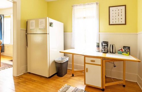 The Sunshine House was built in the early 1900s and maintains much of its original charm, including the cozy front porch! The first floor has a dining room, living room with TV (no cable access but able to be used with your streaming accounts), full kitchen, full bath (with a bathtub/shower combo), and a bedroom with a full bed. The second floor is more of a traditional suite-style layout, with the bed and living area in the front half of the space, and the kitchen and bathroom at the back. There are 2 additional beds in this space. Note: THERE IS NO AIR CONDITIONING at Sunshine House, but fans are provided for warmer days.