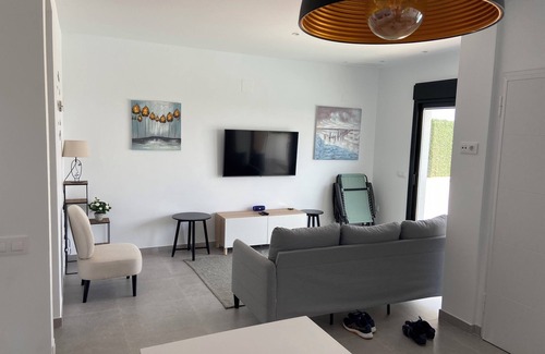 This modern new build Villa with Pool in Roda Village just minutes of a couple of bars and a Local supermarket and Roda golf result and the town of los Alcázares . 3km of Sandy Beach playa Narejos 500 m from supermarket and restaurants. 30 km from Mercia Airport 60 km from Alicante Airport. it has a fantastic solarium with a panoramic view and a kitchen area with a fridge. A barbecue area and chill area and dining. Villa has two bedrooms, two bathrooms and a large lounge with sofa, the flat screen TV leading onto front patio with pool area . The kitchen is fully equipped.in Los Álcázares there are lots of restaurants from every nation. there are also water sports activities. like kite surfing windsurfing and sailing and volleyball on the beach.