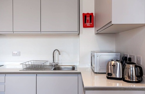 This beautiful apartment has been finished to a high standard and features comfortable furnishings and modern fixtures and fittings. The open plan living area is comprised of a modern fully equipped kitchen with everything you need to cook your own meals at home, a dining table and a space to relax on the sofa and watch the Tv. There is high speed broadband throughout the apartment, as well as a smart Tv with Catch up Tv Apps. The spacious bedrooms feature plenty of storage space for clothes and comfortable beds with crisp hotel linen. The modern bathrooms features powerful showers, as well as complimentary toiletries with fluffy towels for your use. There is a sofa bed for 2 people in the living area that can be made up upon request before arrival, for an additional fee (please select 5 or 6 guests when booking).
