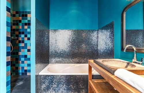 The master bedroom has a queen size bed (160 cm) as well as a single bed (90 cm), the bathroom attached to the bedroom has a nice tiled Italian shower, a large bathtub and 2 sinks.