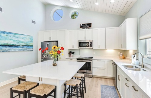 Your vacation begins as soon as you enter the ground level foyer with an open concept kitchen/dining/living room beyond. Glass french doors provide a glimpse of shimmering blue waters, which immediately draw you to the backyard pool and surrounding oasis of fun! Privacy fencing surrounds the backyard which includes lounge seating, outdoor table, putting greens, corn hole toss, and a bocce ball court. When you are ready to head inside, you will find two large king suites, laundry room and a 1 car garage located on the ground level. The poolside king suite has a walk in closet, private en-suite bathroom with a tile shower, TV and door to the pool area. Down the hall you will find another ground level king suite with trundle beds, a walk in closet, vanity and TV. The main bathroom has a tub/shower combo and is located just across the hall. The main living room has a deep, comfy couch with additional chairs and serves as a great place to chat, play games or watch tv. The dining room has seating for 14 with a large table and bar stools at the kitchen counters. The chef in the family will feel right at home in the large, open kitchen, which is stocked with cookware, plenty of dishes and utensils, a traditional coffee maker and a single cup Keurig coffee maker.