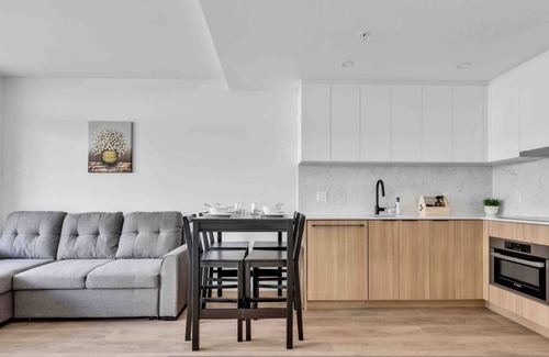 This condo is located in the heart of Surrey, offering north views that are rare and unparalleled in this area. The home offers 1 bedroom, a pullout couch, a spacious living room, a full kitchen, a sizeable patio, and an in-suite washer and dryer.