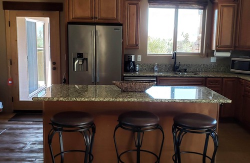 Custom built Tuscan style 3 bedroom 2 bath home. Accommodates 6 guests comfortably. Large open floor plan. Natural desert plants fill the property. Beautiful patio with swing bench, picnic table, and top of the line jacuzzi spa w/ waterfall feature and LED lighting effects, pool table. Great for gathering family and friends for some special time together.