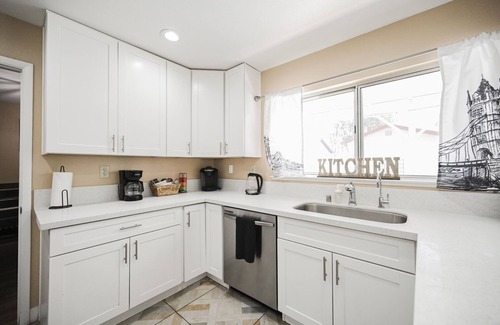 This home has a fully stocked kitchen with dishes, cookware, utensils, blender, toaster, microwave, coffee maker, and many more amenities for the guests to enjoy during the stay. It is also equipped with all essential new appliances including a refrigerator, dishwasher, stovetop, oven, and microwave.