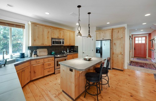 Fully equipped kitchen with open floor plan to the dining and living room area, replete with island, bar stools, spices, coffee, the basics to get you started. Wide plank wood floors, stone gas fireplace, high ceiling, very large private back deck with gas BBQ make this peaceful cul-de-sac retreat.