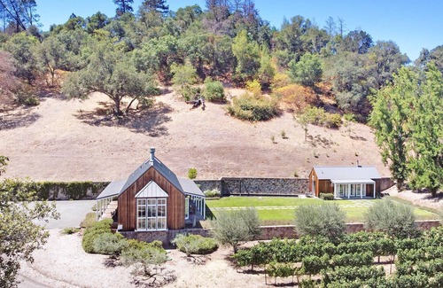 The main house features warm interiors, dramatic soaring ceilings, a gourmet kitchen, and dining table with stunning views over the property’s two-acre vineyard and olive trees. Outside you’ll find a large lawn and beautiful pool and lounge area between the main house and the guest studio.
