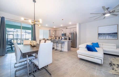 This very stylish 4-bedroom, 4-bathrooms, a vacation home can comfortably accommodate 10 guests throughout 3009 square feet of luxurious living space, offering an ideal size and layout for large families and groups traveling together. The moment you first arrive, this home makes a statement! Lush tropical landscaping surrounds the premises, creating a wonderful oasis-like atmosphere. Inside, the house comes with everything you need to feel as relaxed as possible during your stay, from air conditioning and in-unit laundry machines to wireless internet access and a fully equipped kitchen, featuring a breakfast table with all the necessary cooking appliances. Enjoy your culinary masterpieces around the formal dining room table with seating for 6 in elegance. This modern inspired home will make you feel as though you have transported to another land where time disappears and relaxation is king! Choose this home on your next vacation to sunny Central Florida.