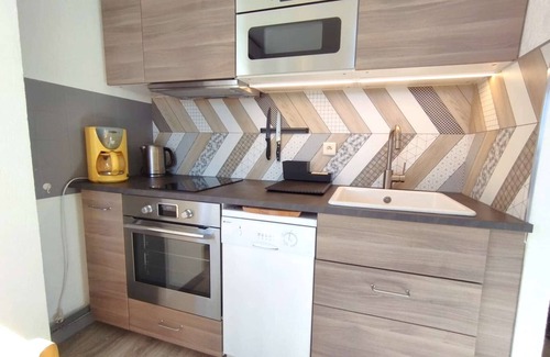 Equipped kitchen area with electric hob, oven, microwave, electric coffee maker, toaster, electric kettle, dishwasher, and raclette grill