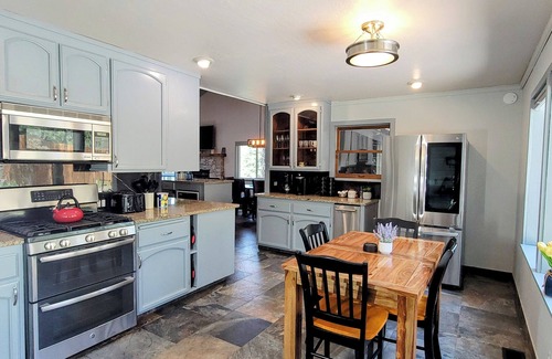 Kitchen - Fully stocked kitchen with Keurig coffee. Enjoy cooking on our gas-burning stove while overlooking the beautiful fenced backyard. Kitchen table seats 4 but can extend to seat 6.
