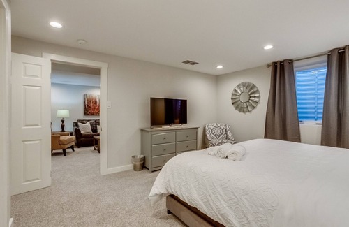 Close to everything Colorado Springs has to offer and plenty of space to relax at the end of the day. Spend the day exploring Pikes Peak, hiking Garden of the Gods, shopping in Old Colorado City, or touring the Air Force Academy. Then, relax in the hot tub or by the cozy fire pit under the back yard pergola. This lovely remodeled ranch with finished basement has plenty of room for your whole group to enjoy spending time together. Bright open-concept living and dining room with wood floors on the main level, completely new kitchen with all-new appliances, and all-new baths. It boasts 5 bedrooms (2 with king beds, 2 with queen beds, and one with a twin-over-full bunk bed) with blackout curtains. We also provide a queen-sized air mattress for 2 additional guests, up to 12 total. Huge lower level family room with TV area, bar and game table for relaxing evenings at home. Great back yard spaces for dining al fresco or warming up around the fire pit.