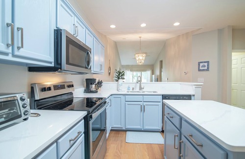 Nestled in the True Blue Community, "Blue Haven" is a delightful Garden Home featuring 2 bedrooms and 2 bathrooms. It offers 1 king bed and 2 Twin beds, and also has a queen size pull out couch in the living room. The fully stocked kitchen ensures you'll have everything you need for meal preparation. Enjoy the serene screened-in porch and private patio, overlooking a tranquil pond with the soothing sound of a fountain.