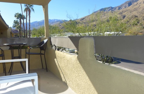 Recently renovated 2nd floor condo within a quiet gated community, in a prestigious neighbourhood of South Palm Springs. Minimalist mid-mod decor. Private front and rear balconies with mountain views and seating, resort like facilities with solar heated swimming pools, Jacuzzi, gym, sauna, ping pong, basket ball, pool table, and BBQ pits. Walking distance to restaurants, bars, stores, botanical gardens, hiking trails.