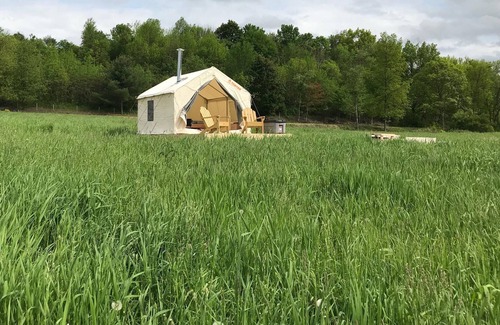 Make some memories, start family traditions! Come and enjoy our little slice of heaven, right on the Hudson River, with a 1 acre pond w/sandy beach, right outside your tent! (The spring fed pond is refilled each season and is FULL between MID TO LATE JUNE, depending on weather. Toward the end of the season (late August) it becomes more overgrown with nature, making less swimming area, but still usable.) We're on 160 acres. Included in your stay are two sit upon kayaks and beach toys available for pond play, along with 3 regular kayaks, with life jackets for river exploration. Firewood is included for your stay! Fishing in the Hudson is catch and release. Bedding and paddle boards can be ordered under "Extras" for an extra fee.