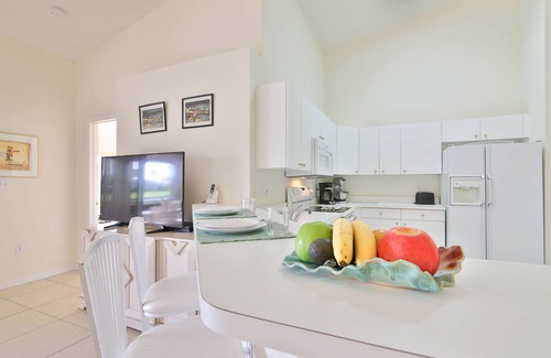 The master bedroom offers a king size bed, has a spacious en-suite bathroom and a large walk in closet.The master bathroom has a double sink vanity and walk-in shower. Getting ready after a round of golf to head out to your favorite restaurant will be a breeze. The spacious second bedroom has a queen size bed and is just across the hall from the second bathroom with a full sized bathtub shower combo. The large covered patio facing the golf course and lake will most likely be one of your favorite spots. Sit back, relax, read a book, play some games, or enjoy a cocktail. The kitchen is very well stocked with everything you need to prepare anything from a light breakfast to a full dinner. The living room has plenty of comfortable seating for everyone, a large smart TV, and of course, you can always stay connected with free high speed WiFi internet throughout the home.