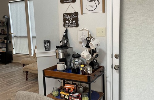 The entry way opens into an inviting living room. The living room has a 65inch 4k smart TV. From the living room it opens to the dinning and kitchen area. A fully equipped kitchen with extras such as a rice cooker, hand mixer, griddle, and more. The dining table can fit 6 and the bar has 2 stools. There is a full coffee and tea bar. Also, on the first floor you will find a half bath.