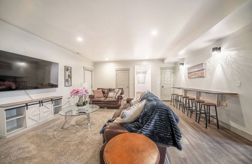 The apartment sleeps 8 comfortably, — the entire place is yours during your stay. In total: 2 Kings, 2 Queen beds, 3 bathrooms, Wi-Fi, a full kitchen, laundry, and flat-screen TVs with Roku.
