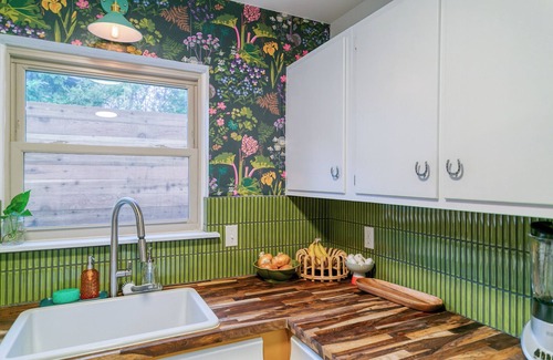 The house features three bedrooms with bold colors and warm lighting, all with queen beds, memory foam mattresses, and bedside charging stations. Sleep comfortably in 100% cotton sateen sheets washed with hypoallergenic detergent (in consideration of guests with skin sensitivities).