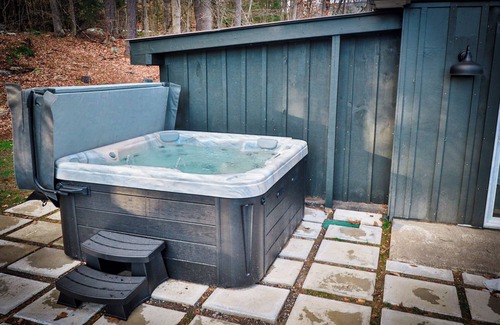 This brand new, modern, spacious two-bedroom, two-bathroom home features a hot tub, and three fireplaces, and is located just outside the Lake George Village, comfortably sleeping six.