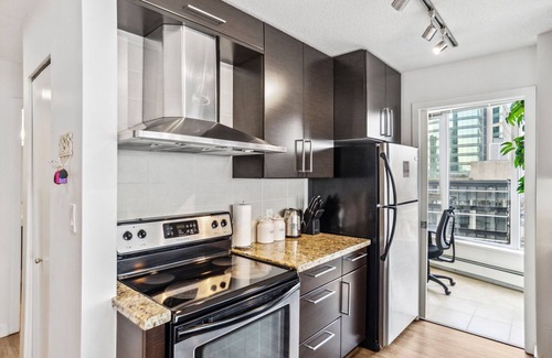 Luxurious furnished 2 BR +2 Bath +Den & Terrace AC apartment in downtown with beautiful views.close to rogers arena ,bc place ,international village mall etc.etc.Skytrain (metro) station is steps away