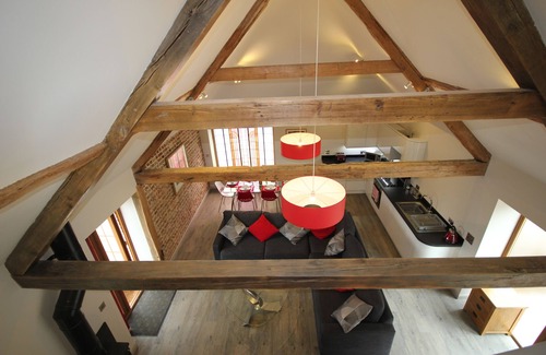 The Barn is the most characteristic of our self-catering cottages. Occupying the west end of the farmhouse this delightful self-catering accommodation has been converted from the old barn. On the ground floor there is a king-size bedroom, luxury bathroom with shower and bath and an open plan vaulted living/ kitchen/dinning area to seat 6. The Barn features a well-equipped modern kitchen, smart television with DVD player CD Radio, free Wi-Fi, large sofa with integrated king-size sofa bed, wood burning stove and The Diana Dors* stained glass window. The galleried mezzanine floor contains a king-size bed,alternatively 2 single beds are available. A set of glazed patio doors lead out to a small garden and decking area, with garden furniture, ideal for outside eating, weather permitting.