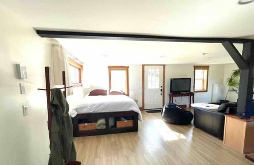 Welcome to a stunningly transformed barn, now a contemporary sanctuary boasting an expansive open floor plan. The lower level greets you with a comfortable queen bed, a luxurious full bathroom featuring a rejuvenating jacuzzi tub, and a fully equipped kitchen adorned with sleek granite countertops. Relax on the plush recliner or sink into the cozy LoveSac bean bag while enjoying your favorite shows on the RokuTV.