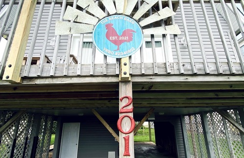 4 Bedroom/ 2 bath, huge deck, and fire pit. Lots of beach chairs and one wagon available for guest to use. You will need to provide your own beach towels. Ocean views with a short walk to beach; paved the whole way to make wagon pulling a breeze. Walking distance to neighborhood playground, grocery/bait store, restaurant, and much more. NO smoking/vaping. 9:30 a.m. check out time. Fresh Linens/towels are placed in a sanitized plastic storage bin in each room for guests to use.
