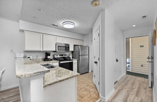 Welcome to our Myrtle Beach condo, Centrally located just 5 miles to the ocean, minutes to 501, airport, restaurants, outlets, and more! The Beach Hive is a beautiful golfers retreat, stylishly decorated, fully stocked with a with a ready to use kitchen, community pool, private patio and a golf course in the backyard, doesn’t get much better in Myrtle Beach. When you enter you’ll immediately notice all the bright natural light and feel at ease.