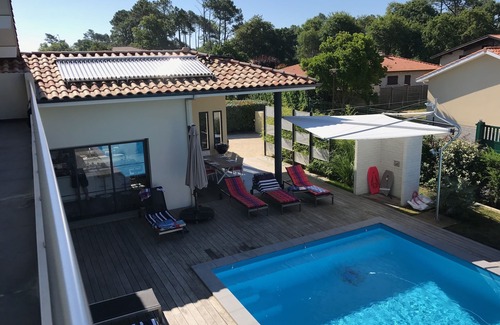 This exclusive holiday villa, completed in 2014, is located in the trendy surfing and bathing resort of Vieux Boucau les Bains, on one of the most beautiful stretches of beach in the extensive "Les Landes". We tried to think of everything to make your stay as pleasant as possible. Living comfort, equipment and the beautiful pool area leave nothing to be desired. The spacious and quiet holiday villa is of modern architecture and stands on a fenced, approx. 1,200 sqm plot with a large lawn, beautiful outdoor seating areas and the highlight of a 10 x 5 m outdoor pool with a beautiful border in wood and flowing transition into the Terrace and lounging area. High-quality stainless steel loungers, side tables, sun protection, lounge area and a second, covered terrace with dining table, chairs, kettle grill (Weber) and sophisticated privacy screen with lighting allow plenty of opportunities to develop outdoors. From breakfast to an evening glass of red wine by the pool, you can relax and unwind here. The outdoor kitchen helps a little. An electric gate closes the entrance area, in addition to plenty of space for parking, there is a garage in which you can also use the car. B. Can accommodate bicycles, surfing and golfing equipment. Inside, the house surprises with its spacious layout, high-quality materials and a lot of technical sophistication. A kitchen that delights every hobby cook, even a Nespresso and Jura coffee machine are ready to prepare your morning coffee, large, modern bathrooms, air-conditioned bedrooms (all bedrooms) with TVs and a dignified living / dining area with lots of windows and a view of the pool are only some striking details. It is about 800 m to the beach "La Plage des Sablères", and the center of the seaside resort, which is lively in the summer months, can be reached on foot in about 10 minutes. Vieux Boucau is known for its beaches, not only on the open Atlantic, but also on the "Lac Marin", a large lake fed by sea water that stretches south to the town center.