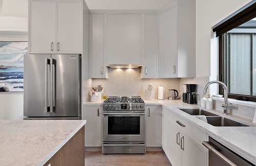Frigidaire Professional appliances, gas range, dishwasher, quartz countertops & backsplashes.