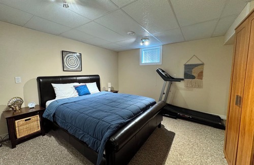 The upstairs open concept bedroom features a solid Maple wood king size bed with its own ensuite. The ensuite has a walk-in shower and a bathtub. The main floor bedroom with queen bed makes it accessible for anyone with mobility issues and the main floor bathroom also has a walk-in shower