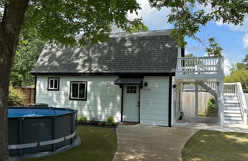Stay in a fully remodeled barn-style home just 10 minutes from Wrightsville Beach. Mid-century modern meets boho in this 2-bedroom, 2-bath retreat featuring a spiral staircase, waterfall shower, and private yard surrounded by azaleas. Enjoy a covered patio, balcony, and 14-ft round above-ground pool. Perfect for two couples or families, each floor provides its own bed and bath. Located in a quiet neighborhood, this sanctuary offers the ideal blend of privacy and convenience