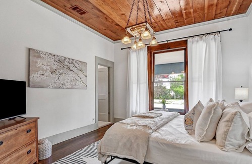 Fantastic early 20th Century home located near Historic Downtown Denison and a short drive to Lake Texoma and Choctaw Casino. Denison offers great locally owned restaurants, local breweries, wineries, and distilleries. Our home includes a master bedroom (king bed, tv, and on suite bath with his and hers closets) and guest bedroom (queen bed and tv) with additional bath downstairs. The upstairs is a great large private space (queen bed and tv). The outdoor space includes barn and fire-pit. We welcome your fur babies at The Beverly. The backyard is large, but not fenced. We have three in-ground leashes in the backyard that hold up to 100 lbs each to keep your puppy safe.